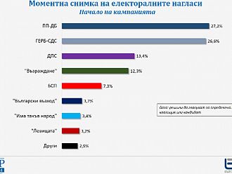Ако изборите бяха в началото на март, резултатът вероятно щеше да е следният: ПП-ДБ и ГЕРБ-СДС щяха да имат почти идентична подкрепа с 27,2% и 26,6%, ДПС и "Възраждане" са другата двойка със сходни резултати и биха оспорвали третото място, съответно с 13,4% и 12,3%. Със 7,3% БСП е на петото място.
